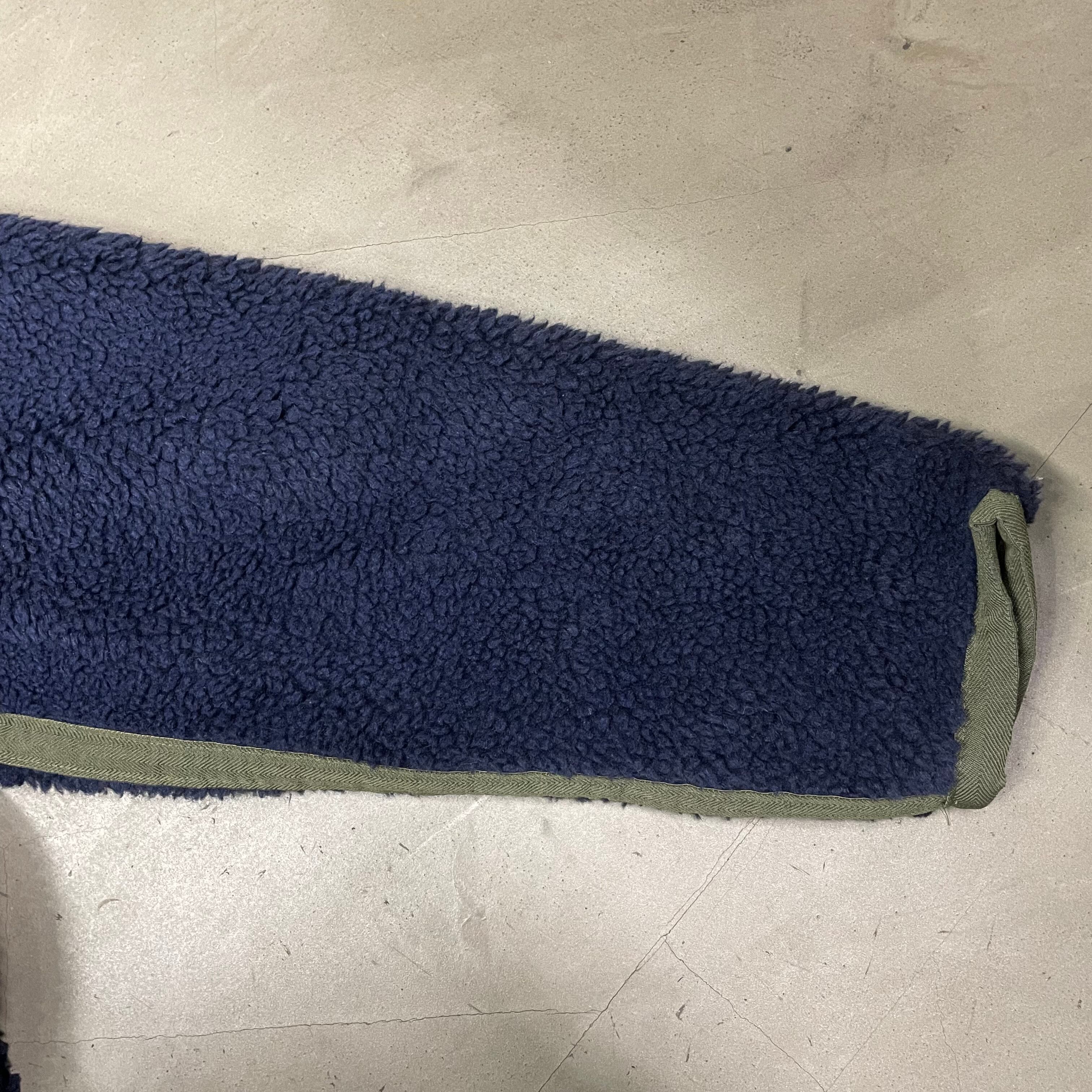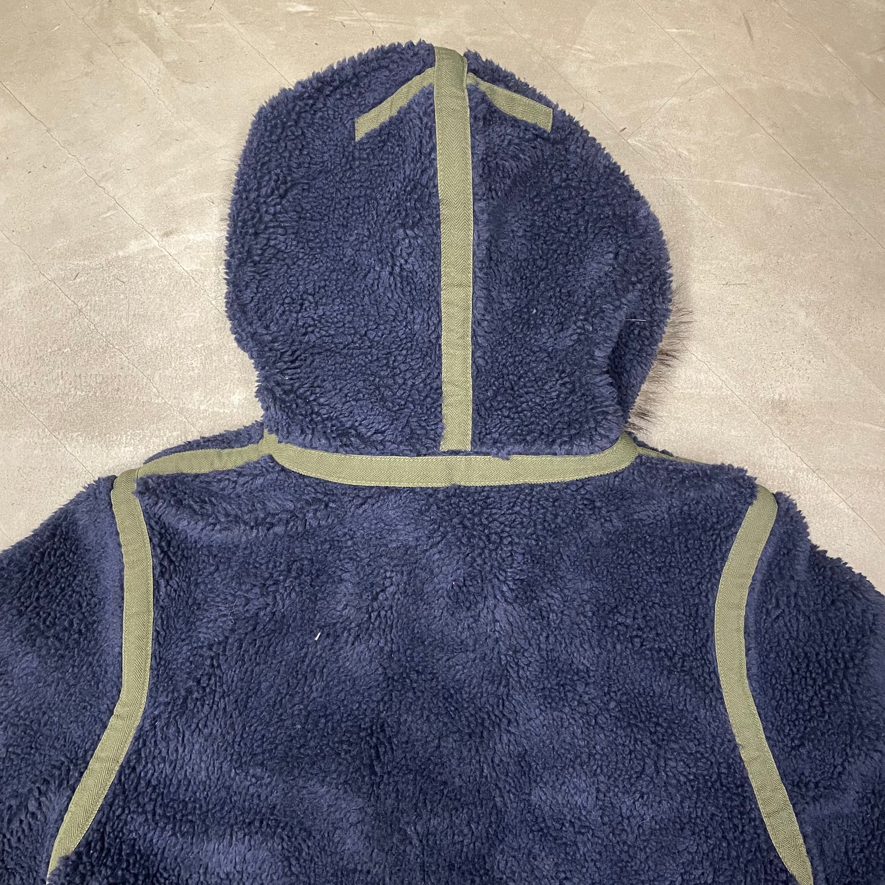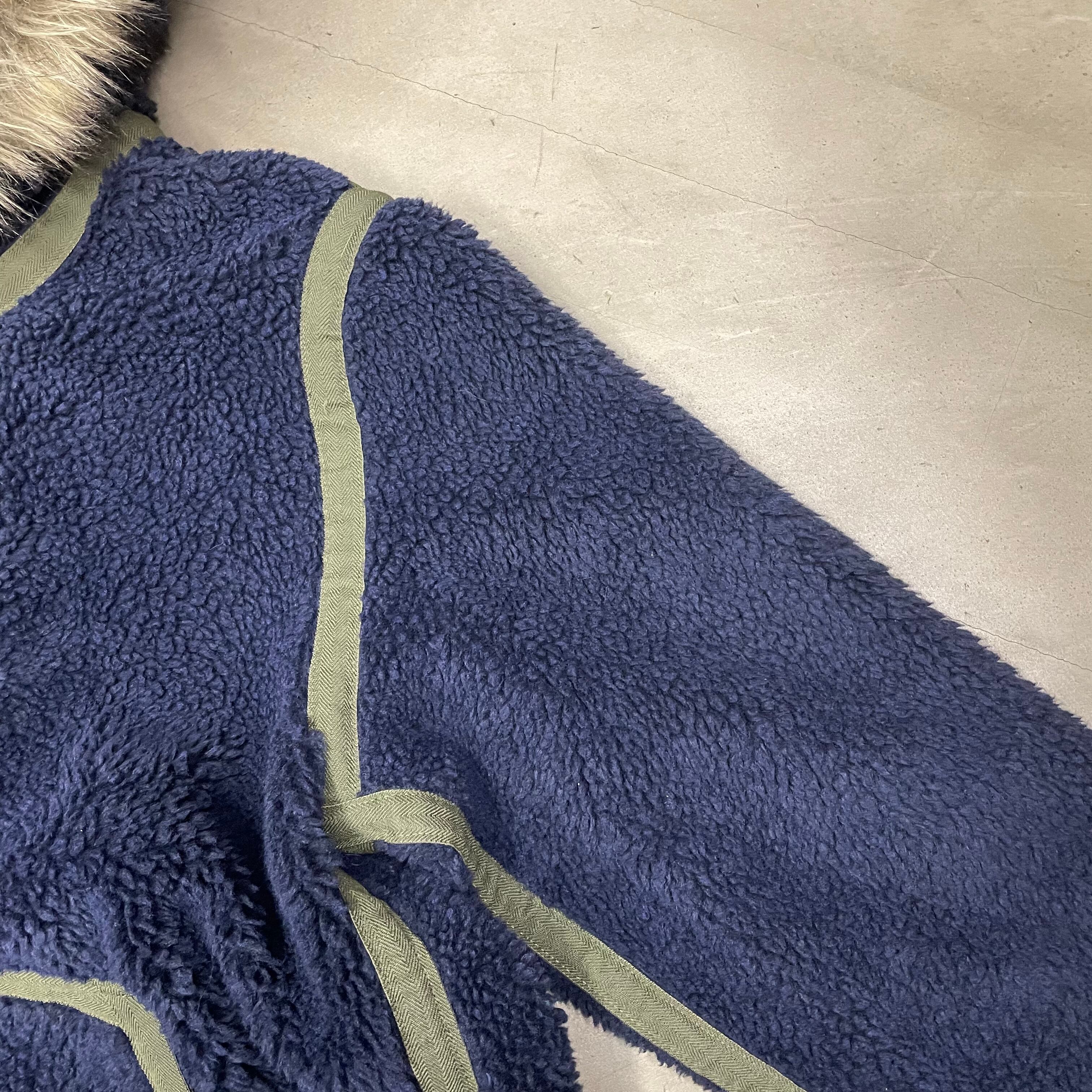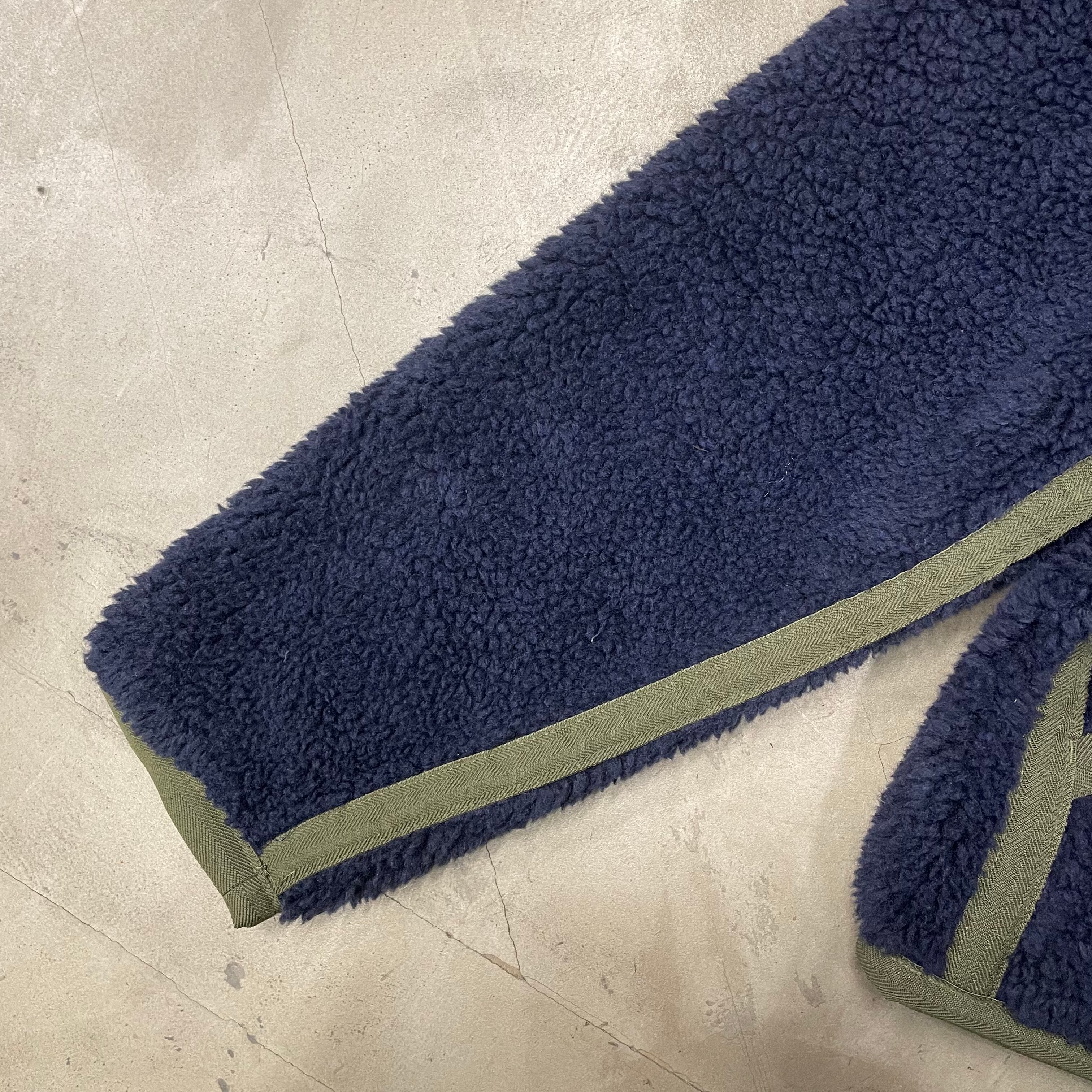 紺色のパイルフリースのボディにオリーブのヘリンボーン生地のトリミング。