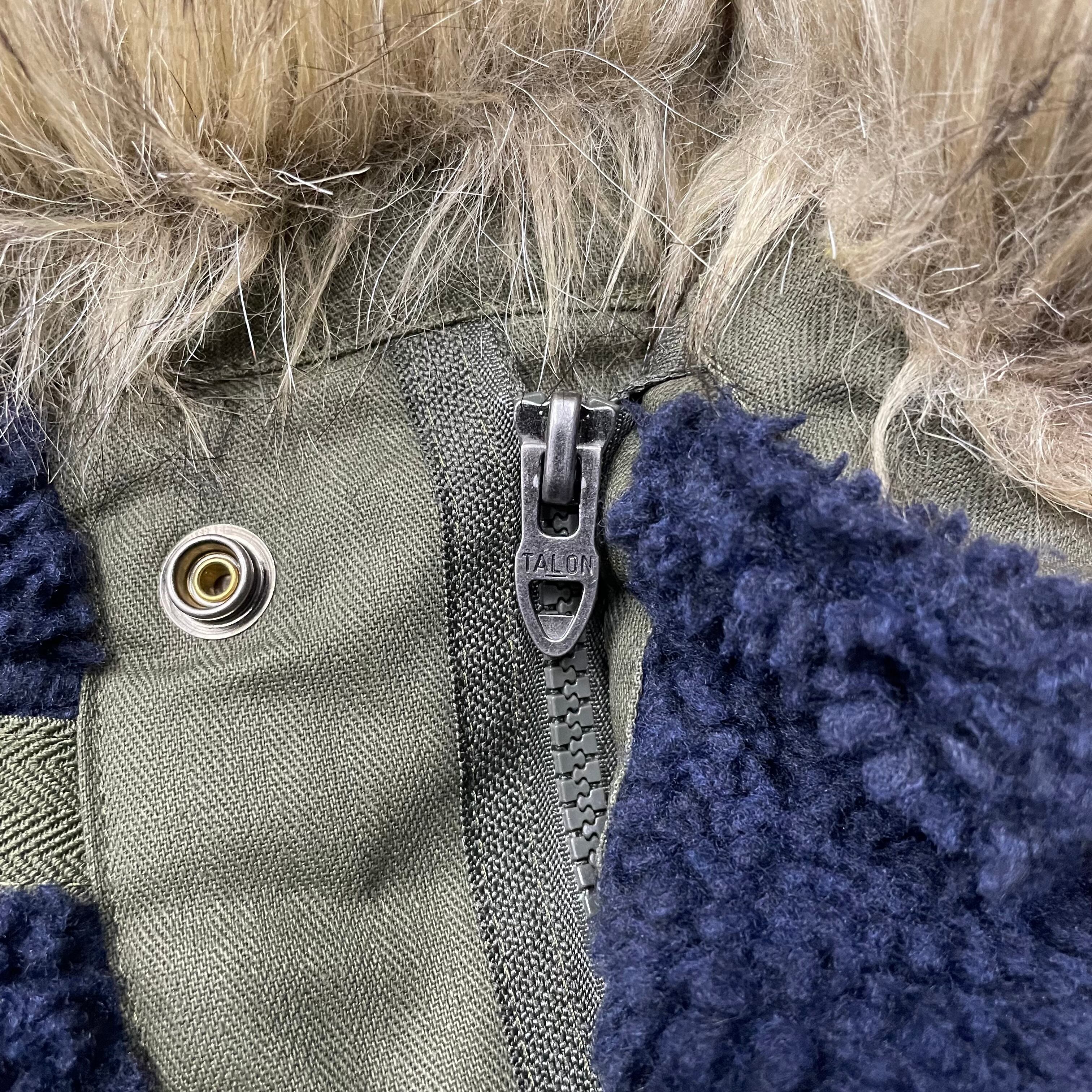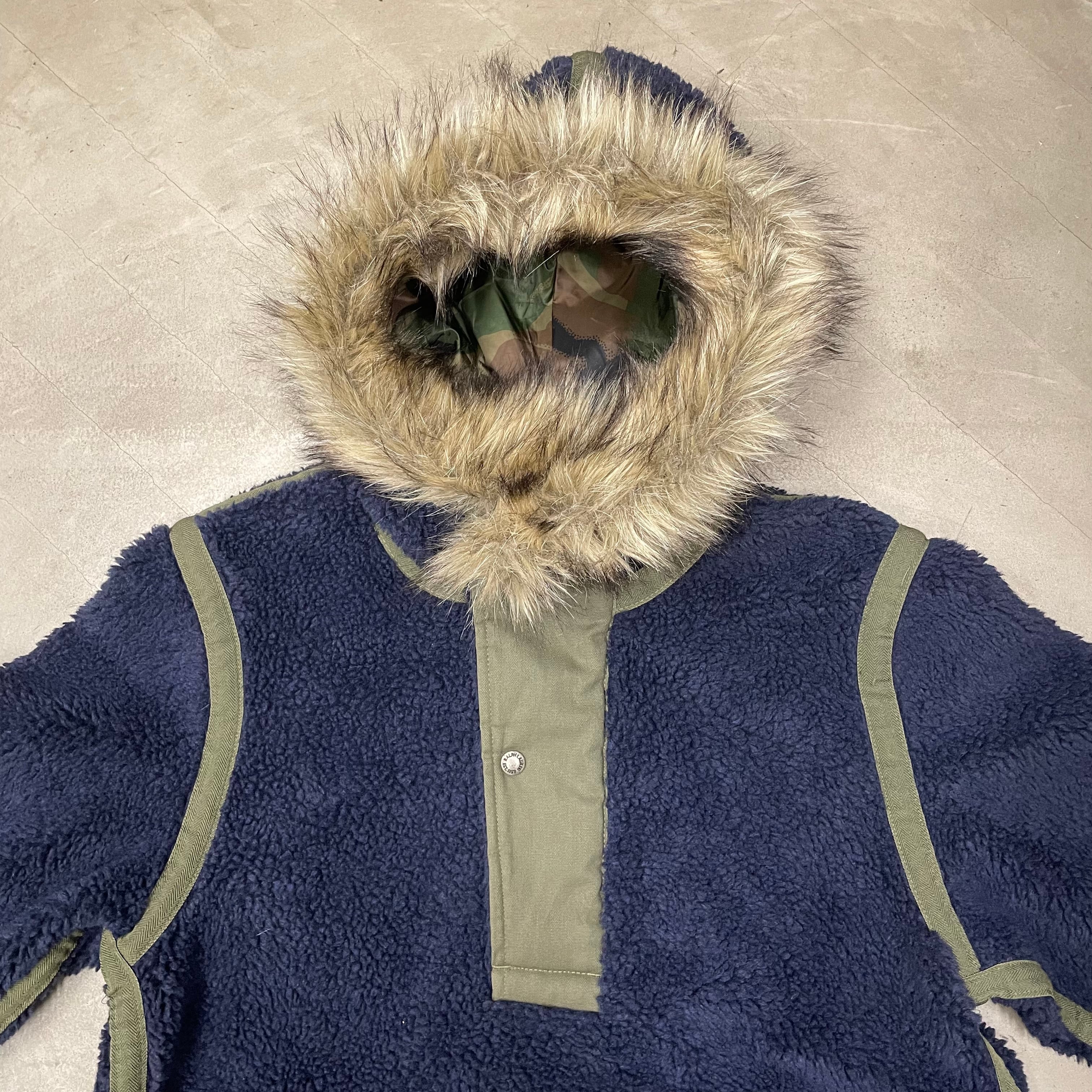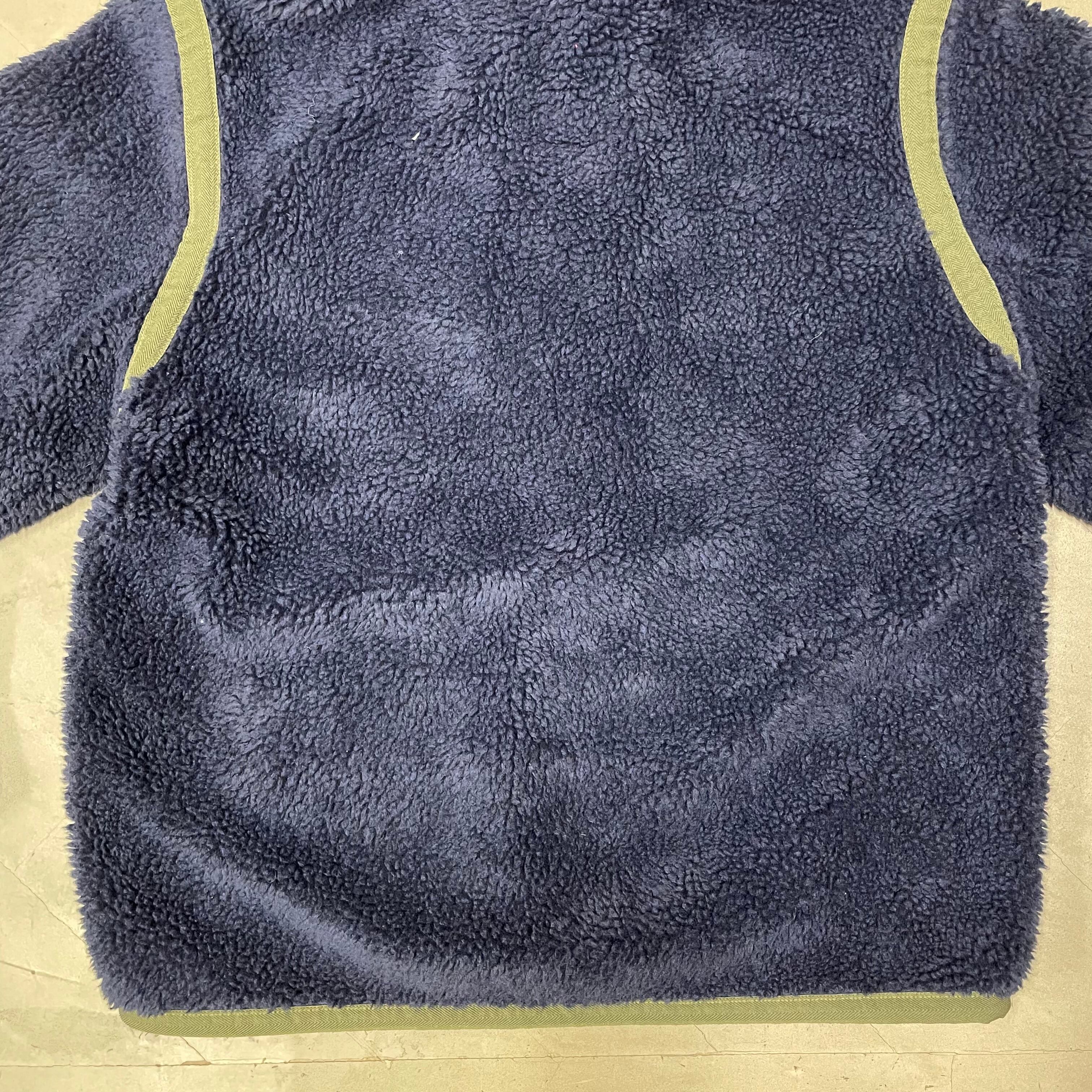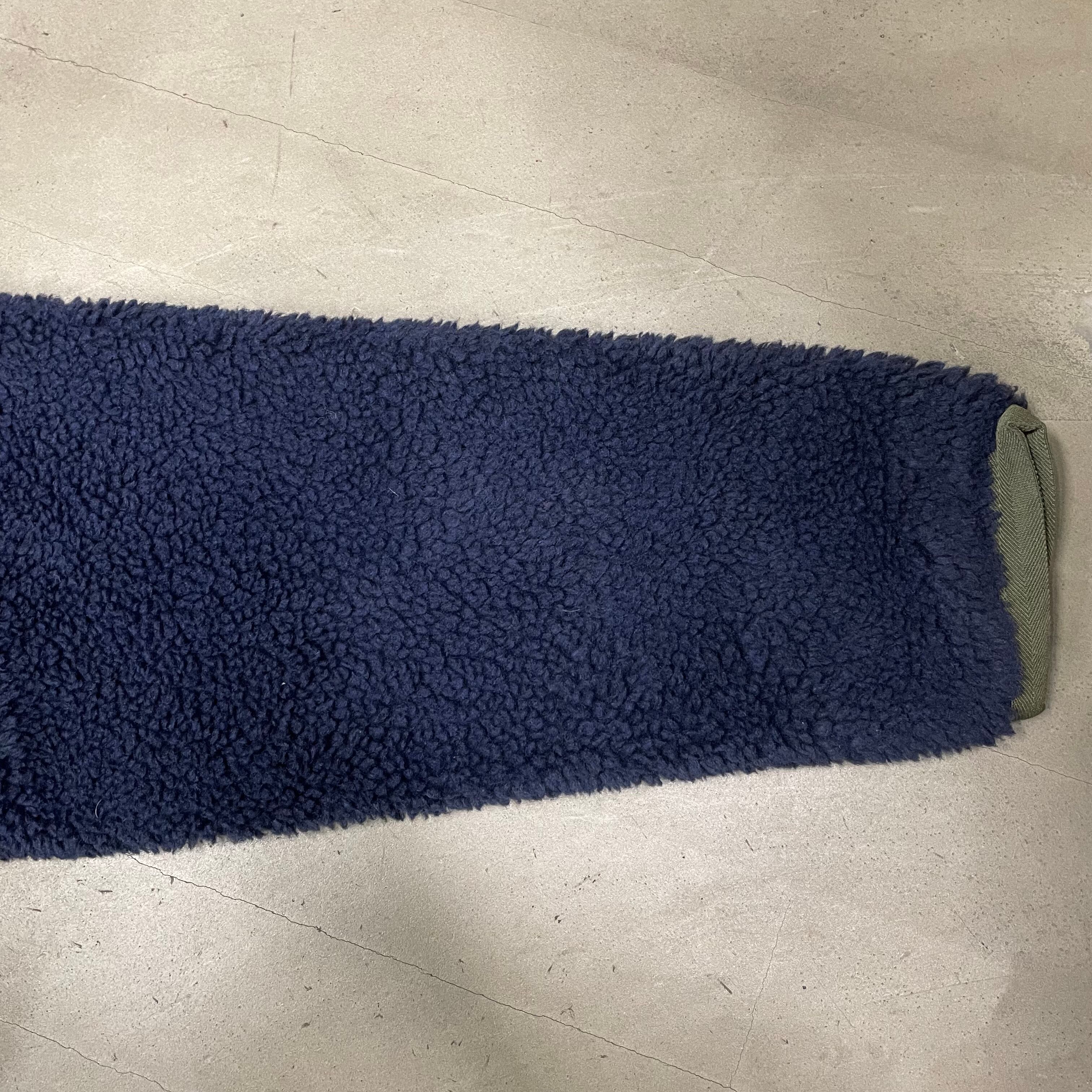 紺色のパイルフリースのボディにオリーブのヘリンボーン生地のトリミング。