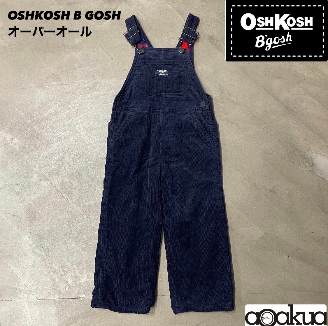OSHKOSH B GOSH コーデュロイオーバーオールのネイビーになります。裏地はチェック柄になっています。ダメージ、汚れに関して、目立ったものは見られませんが、使用感がございます。写真をご参照ください。